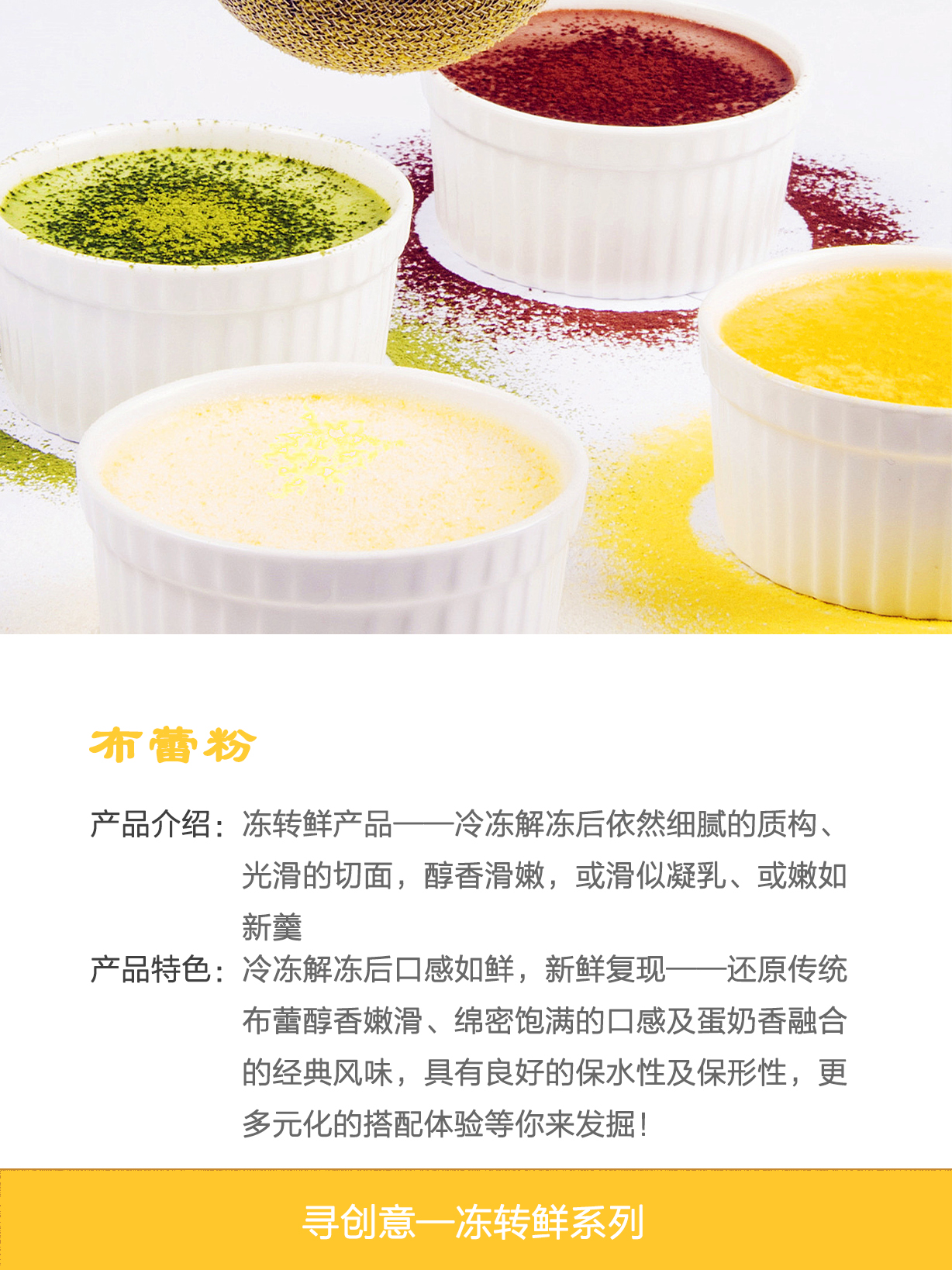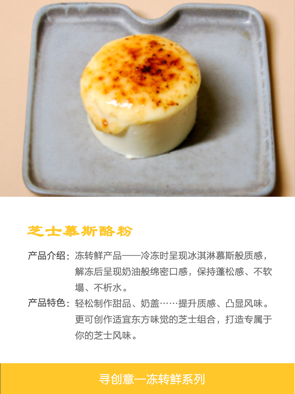 冻转鲜——冷冻时呈冰淇淋慕斯般质感;解冻时呈奶油般绵密口感,适宜东方味觉的芝士风味